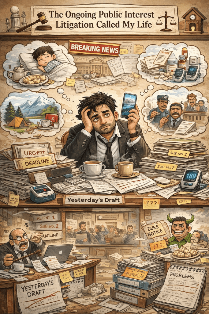 There are people whose mornings begin with yoga, sunlight, gratitude, and perhaps a calm cup of tea. My mornings begin with a negotiation between my soul, my sugar levels, my phone battery, and the accumulated nonsense of several fully grown adults who should have made better choices before involving me. By the time some people are choosing between oats and poha, I am already mentally preparing arguments, replying to messages, remembering which matter is in which court, locating one missing document, cursing one impossible litigant, and wondering if my own endocrine system has also filed a counterclaim against me.