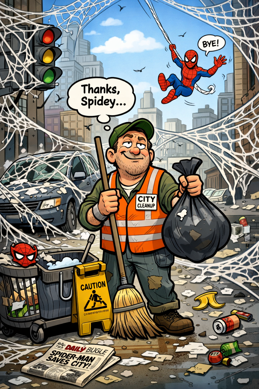 There are two kinds of heroes in this world. The first kind swings between buildings, saves the city, and disappears just when things start getting inconvenient. You know, the Spider-Man category. The second kind stands quietly on the road with a broom in one hand and a garbage bag in the other, staring at sticky webs everywhere, wondering how this became his problem.
